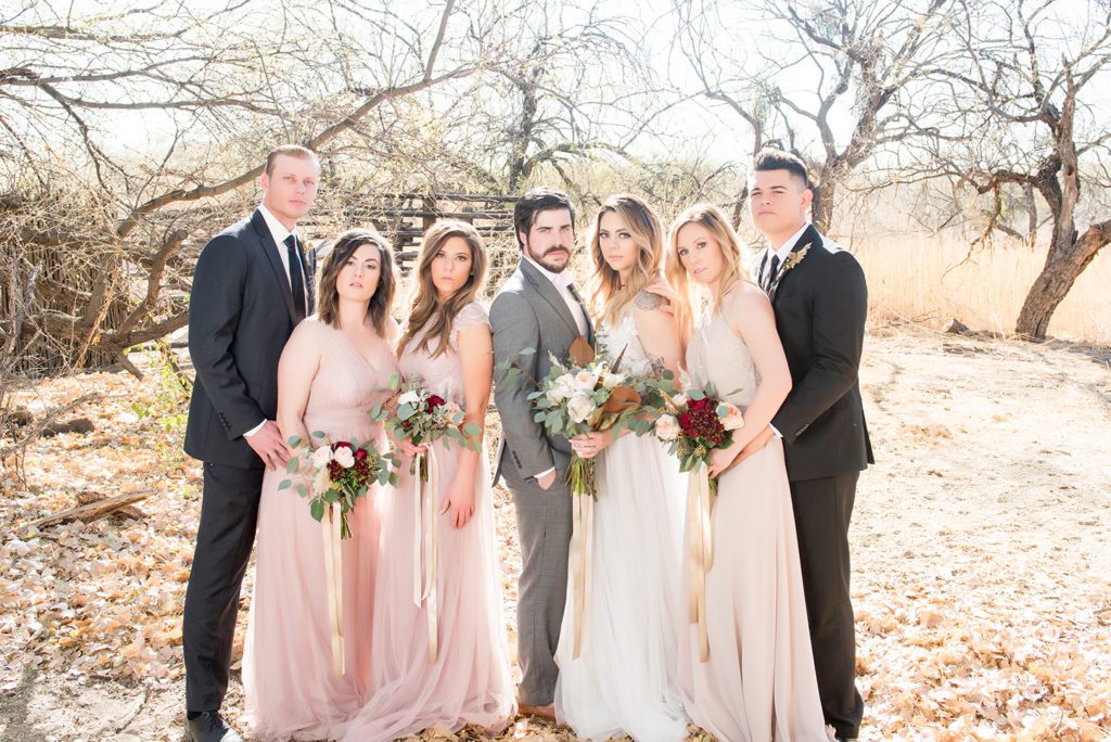 Jordan and Benjamin are a real couple. These two had recently eloped, so they were delighted with the idea of doing something a little more elaborate for a photoshoot. So, they got together with their bridesmaids (Kayla, Crista, and Aleisa) and groomsmen (Clayton and John) for an epic Bohemian-styled shoot.
