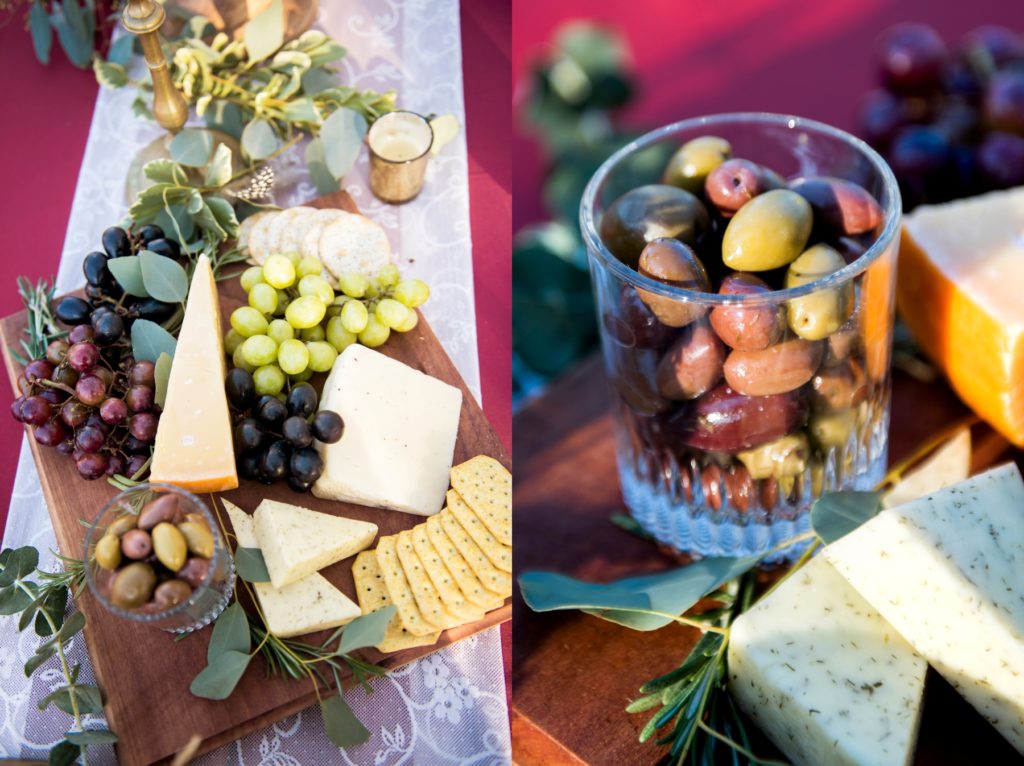Mollee, of Peace and Mind Event Design, also built a beautiful cheese tray and put together a mix of eclectic glassware, table elements, and china, blending in bold reds that carried the vintage vibe through into everything that we saw around us.