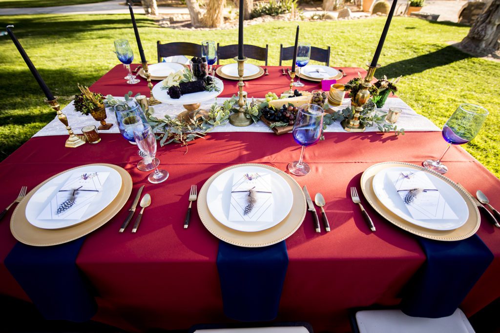Jenn and Akiko, of Soiree Girls, brought the Boho feeling to the forefront with a teepee topped with a desert skull, complete with rug and sage-burning elements for accents. Their bouquets also incorporated desert elements, along with the browns and greens of the magnolia leaf. (That’s right, even though the magnolia tree is known as a symbol of the Southeast, it thrives here in the Southwest, too!) With the teepee set up on top of the mountain at sunset, the whole scene was perfectly romantic and dramatic.